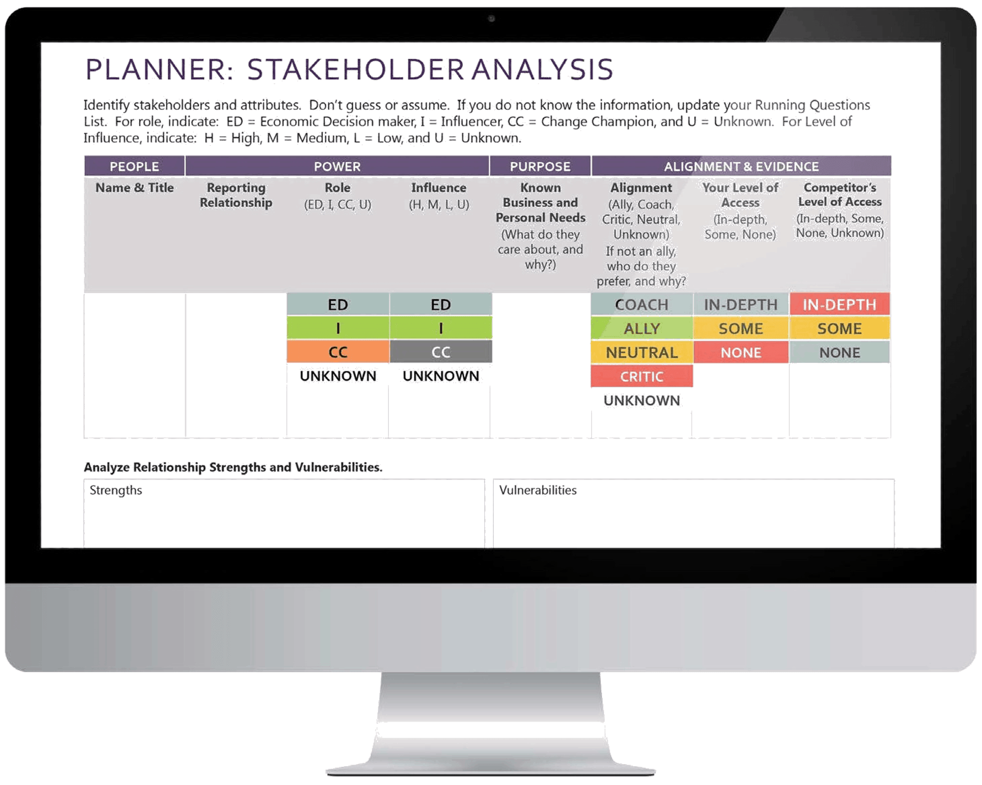 Categorise the stakeholders by their role, level of influence, and alignment with the solution. Take an inventory of your strengths and vulnerabilities. Clarify your key objective, whether it’s to strengthen the relationship, neutralise the competition, or increase the solution’s perceived value.